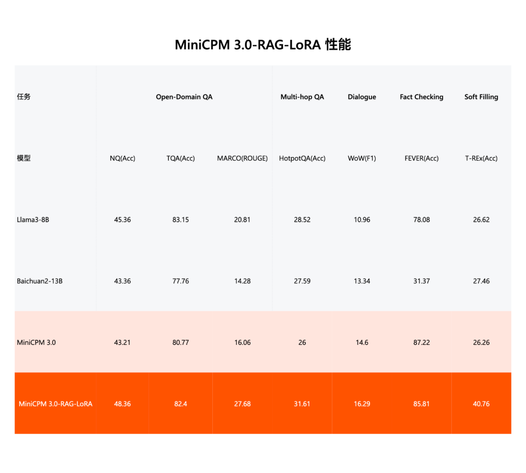 • 经过针对 RAG 场景的 LoRA 训练后,MiniCPM 3.0-RAG-LoRA 在开放域问答(NQ、TQA、MARCO)、多跳问答(HotpotQA)、对话(WoW)、事实核查(FEVER)和信息填充(T-REx)等多项任务上的性能表现,超越 Llama3-8B 和 Baichuan2-13B 等业内优秀模型。