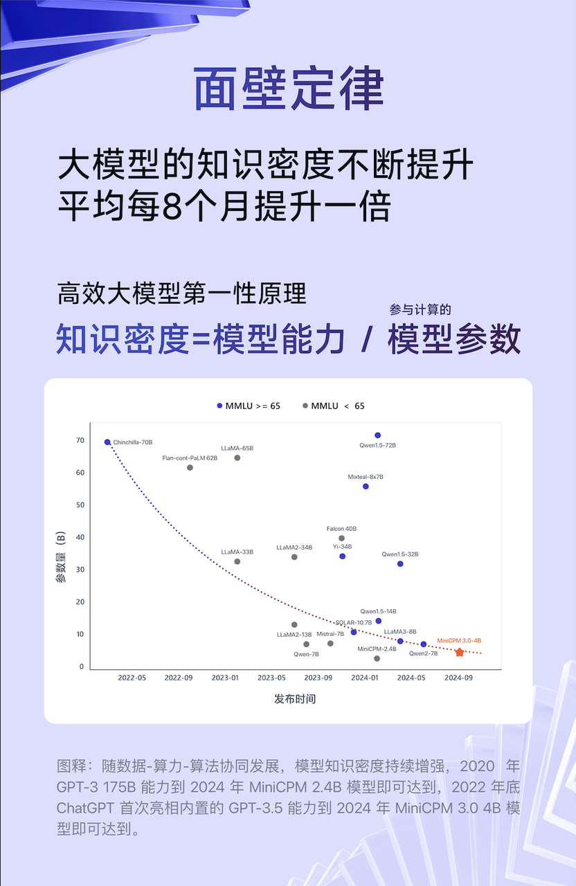 超预期的高效与强悍来自哪里?面壁智能紧紧围绕 Scaling Law 的核心,将提升知识密度视为高效大模型的第一性原理(知识密度 =模型能力/参与计算的模型参数),并且提出了大模型时代的「摩尔定律」:模型知识密度不断提升,平均每 8 个月提升一倍,称之为「面壁定律」。