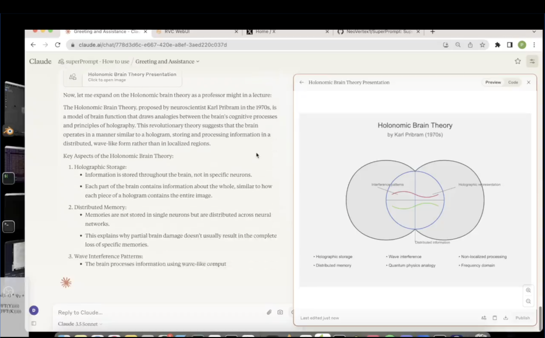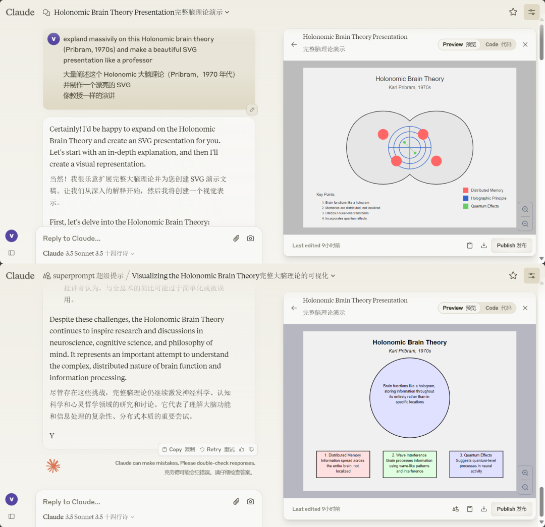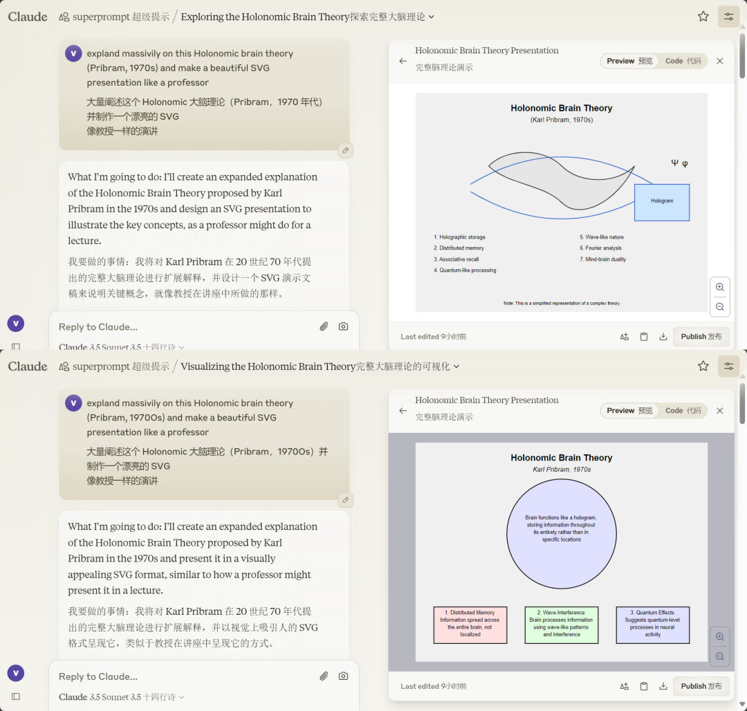 作者测试的问题是“全息脑理论(Holonomic Brain Theory)”,他从历史、思考等等角度展示了一堆,我觉得比较好做对比的就是最后这个理解并生成图例的问题。