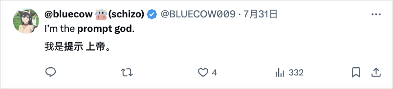 这个所谓的SuperPrompt,来自博主 @BLUECOW009 ,一个在X上自称为prompt god(提示词之神)的人。
