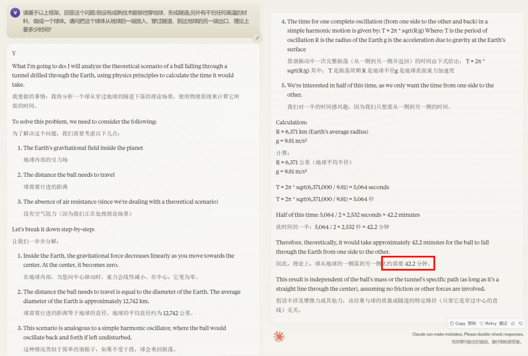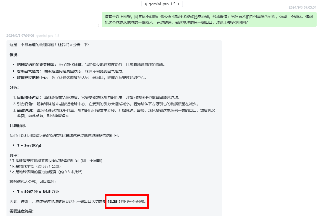 然后我又测试了“地心穿梭”的数学问题:“假设有成熟技术能够挖穿地球,形成隧道;另外有不怕任何高温的材料,做成一个球体。请问把这个球体从地球的一端放入,穿过隧道,到达地球的另一端出口,理论上要多少时间?”