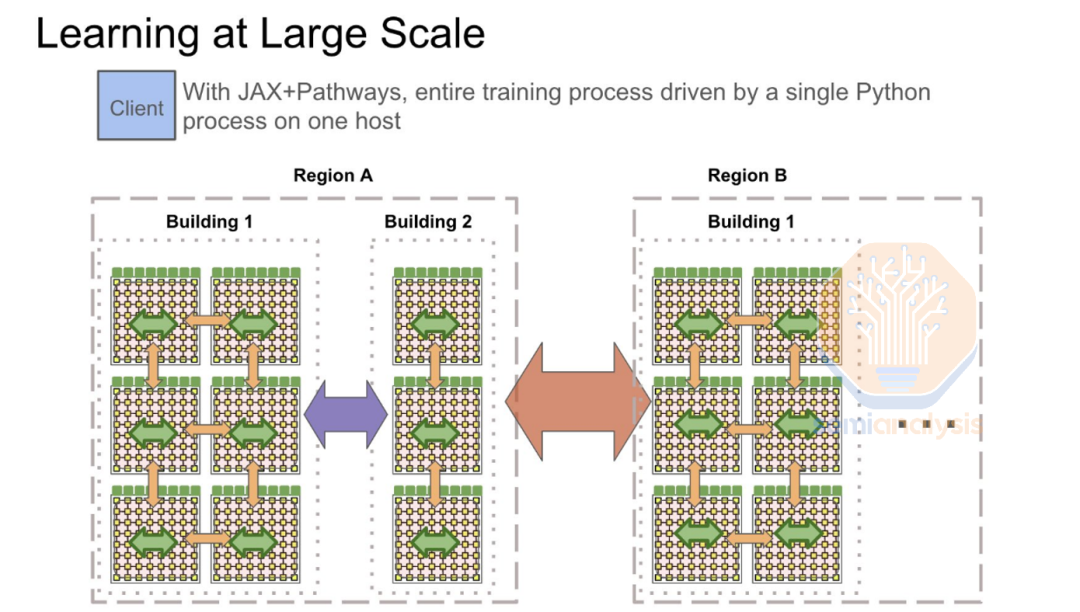 Google、OpenAI 和 Anthropic 已经在执行一个计划,即将其大模型训练从一个站点扩展到多个数据中心(Multi-Datacenter)。谷歌拥有当今世界上最先进的计算系统,并率先大规模使用了许多关键技术,这些技术直到现在才被其他公司采用,例如机架级液冷架构(rack-scale liquid cooled architectures)和多数据中心训练(multi-datacenter training)。