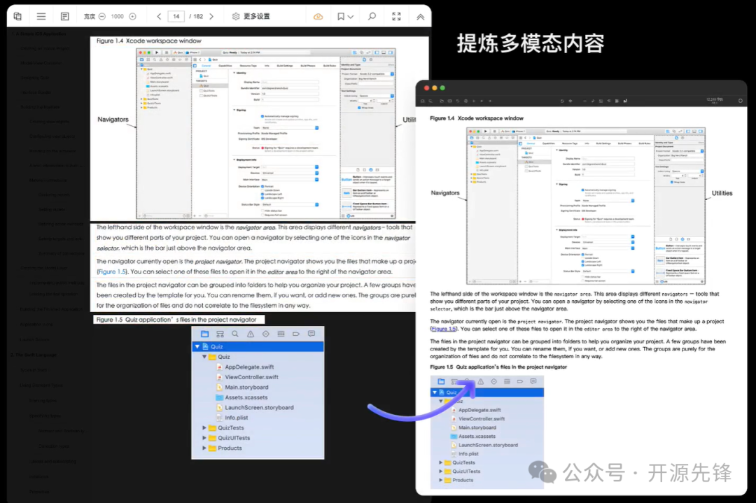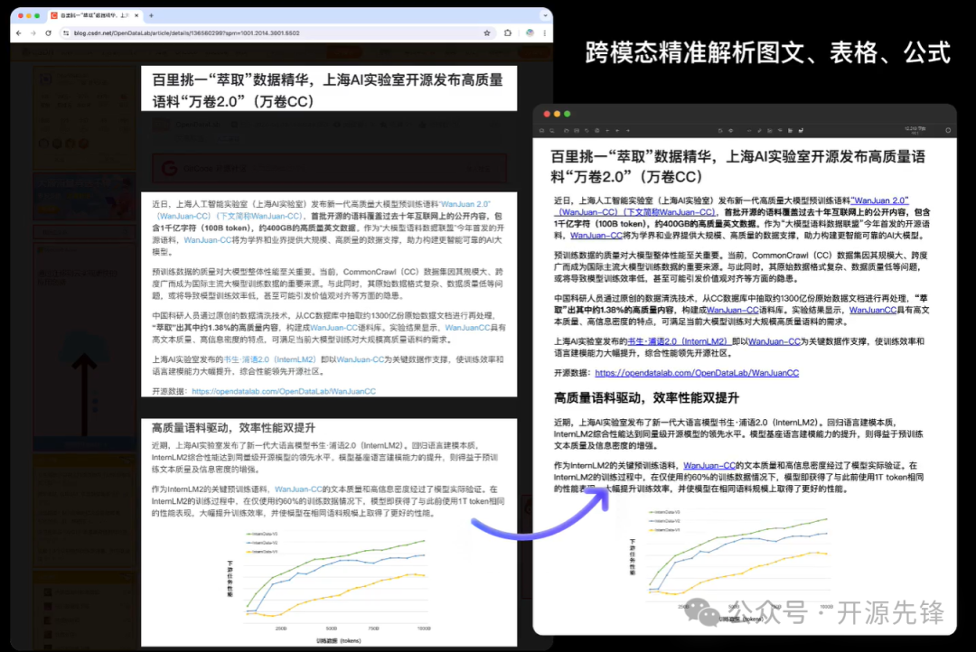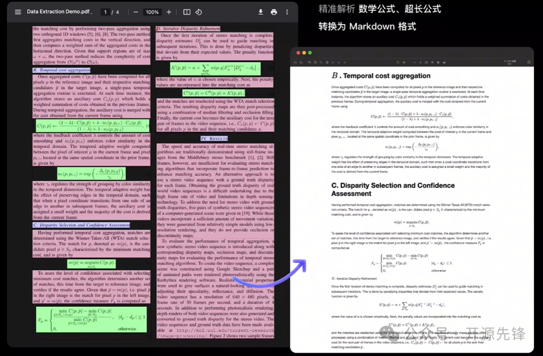 • 多模态文档转换:支持将包含图片、公式、表格、脚注等复杂元素的PDF文档转化为Markdown格式,便于机器阅读和进一步处理。