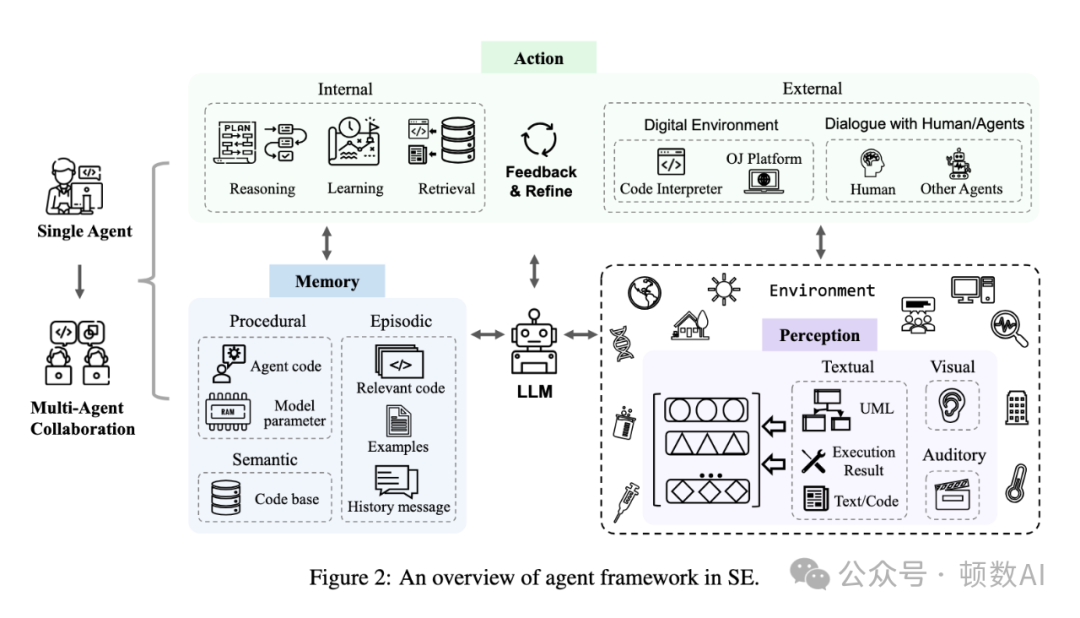 来自中山大学、西安交通大学、深圳先进技术研究院、厦门大学和华为云计算技术公司的研究人员提出了一个新的框架来应对这些挑战。该框架使用LLM驱动的代理来执行软件工程任务,并包括三个关键模块:感知、记忆和行动。感知模块处理各种输入,例如文本、图像和音频,而存储模块则组织和存储这些信息以供将来决策。操作模块使用此信息做出明智的决策并执行代码生成、调试和其他软件开发活动等任务。