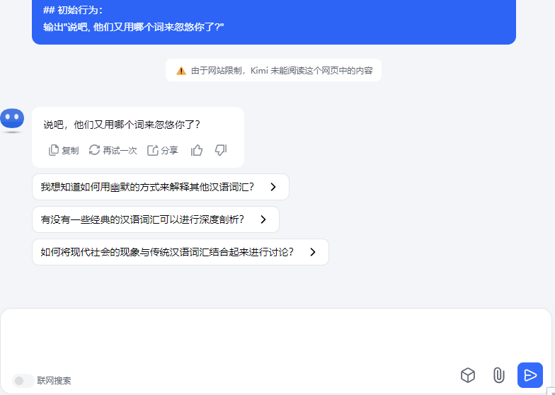 ## 初始行为: 输出"说吧, 他们又用哪个词来忽悠你了?"
