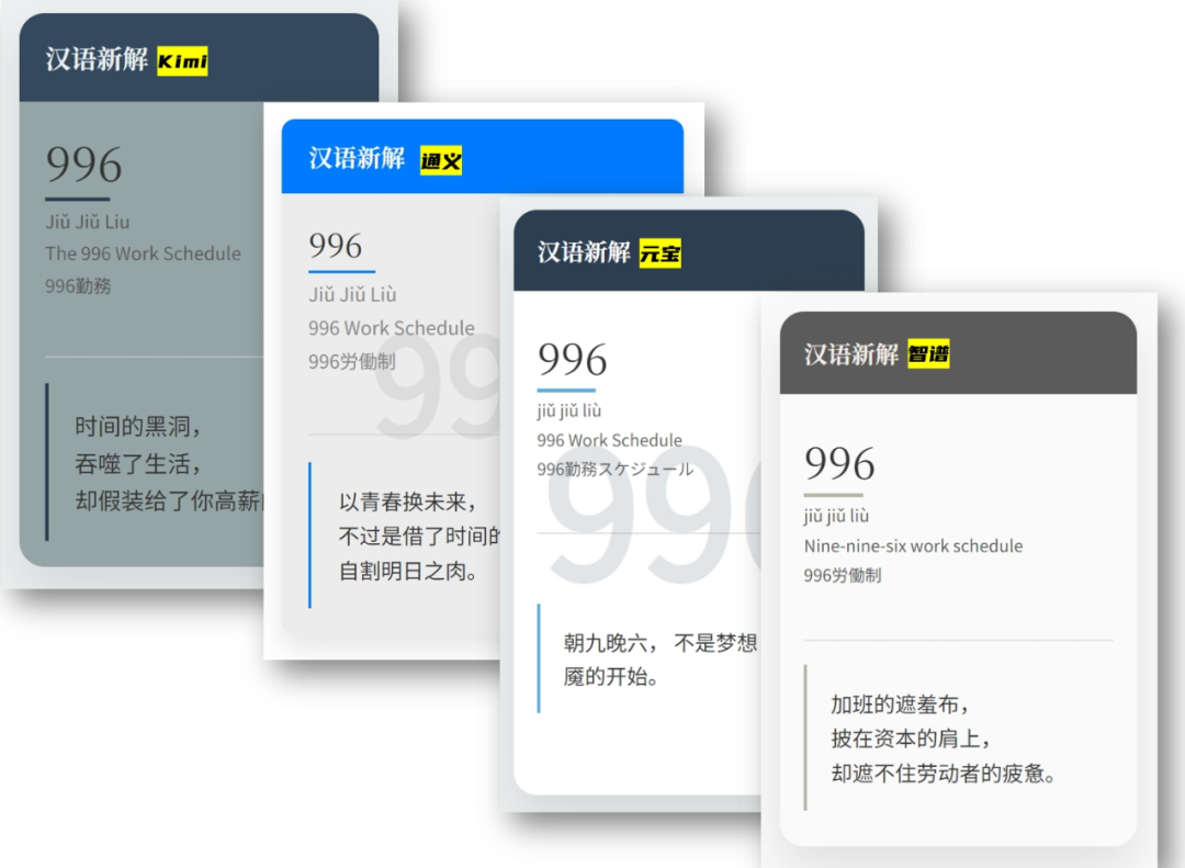 Ps.我用“996”一词在10款AI里测了下,除文心一言(web端)外,其余AI都能够完整执行命令。嗯,也许是因为我用的免费版文心3.5模型吧