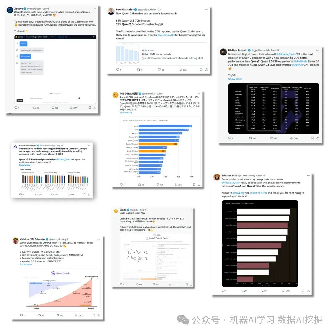 X.com 上到处都在热议Qwen 2.5,世界各地的用户都在不停地讨论这个新的AI巨头: