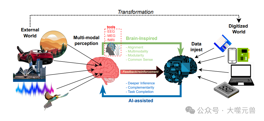 在感知和认知方面,人类智能与多模态基础模型有许多相似之处。首先,两者都依赖于多种感官输入的整合。人类大脑通过不同的神经群体或专门的大脑区域处理不同的感官输入,如视觉、听觉和触觉。类似地,多模态基础模型通过多塔架构处理不同类型的输入数据,如文本、图像和音频,并在共享潜在空间中对齐。