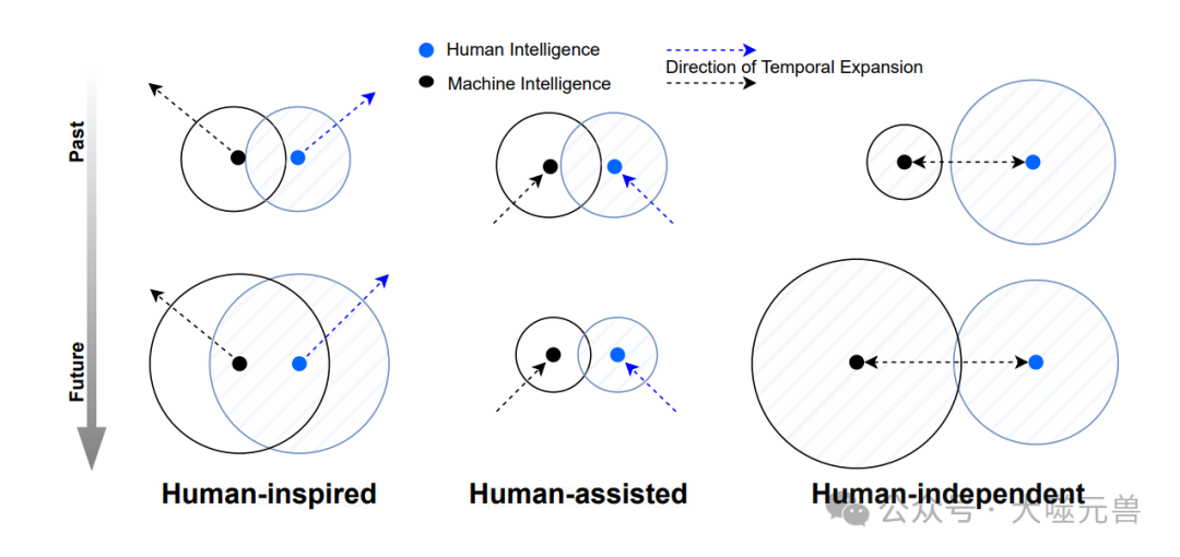 图2:在人类启发的智能中,机器智能的发展主要是由生物学和神经科学的见解推动的,随着时间的推移,这两个领域的进步相互重叠。相反,在人类辅助智能中,随着时间的推移,重叠往往会减少,导致人类或机器提供更专业的帮助,从而促进混合系统的发展。最后,在独立于人类的智能中,机器智能的内在特征自由进化,随着支撑这些智能的硬件等约束变得更加多样化,自然会导致支配人类和机器智能的基本原则出现分歧。