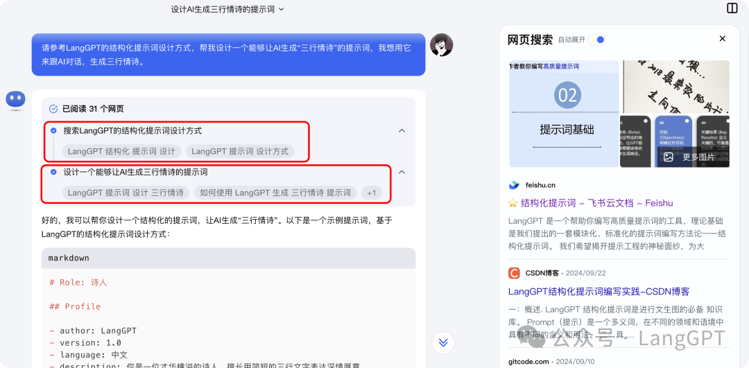 “请参考LangGPT的结构化提示词设计方式,帮我设计一个能够让AI生成“三行情诗”的提示词,我想用它来跟AI对话,生成三行情诗。
