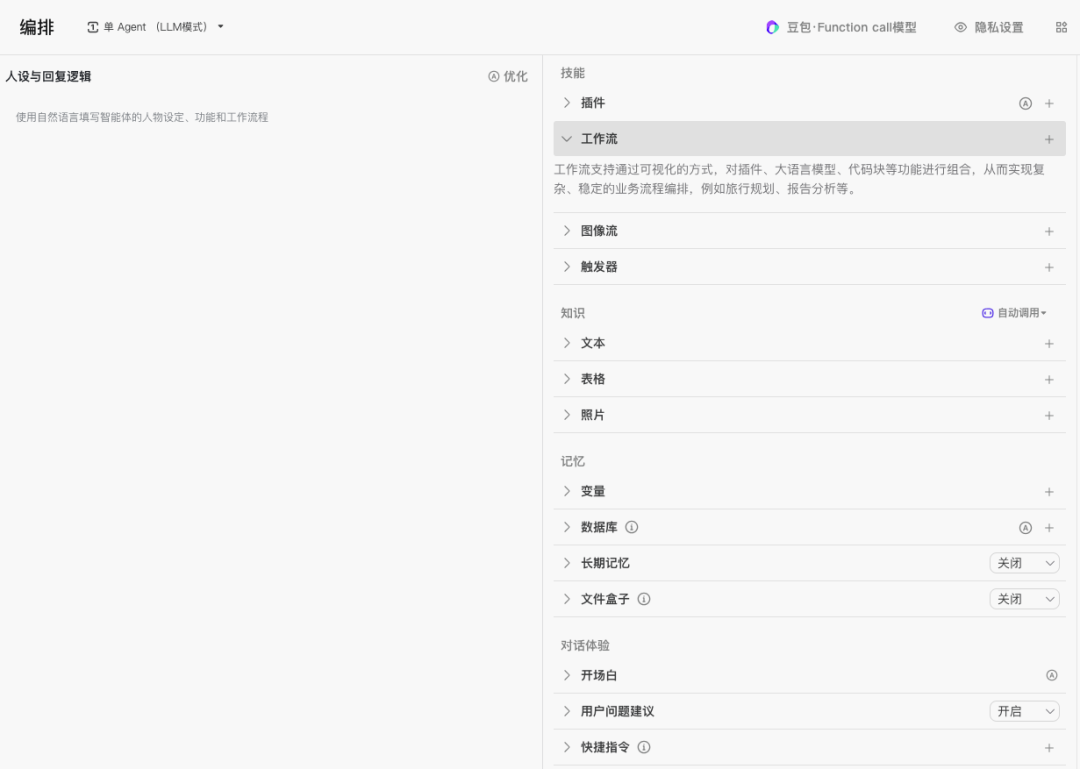 我们先从 coze 的产品设计开始讨论,在 coze 中如果要搭建一个智能体 agent,核心主体是使用 system prompt 定义的 bot,workflow 是等待被 bot 调用的工具, bot 通过 function call 能力决定是否调用 workflow。所以在 coze 的产品设计中,基于自然语言构建的 bot,和通过拖拉拽节点形式化表达的 workflow,这二者的关系不是对等,bot 是上位者,workflow 是下位者。