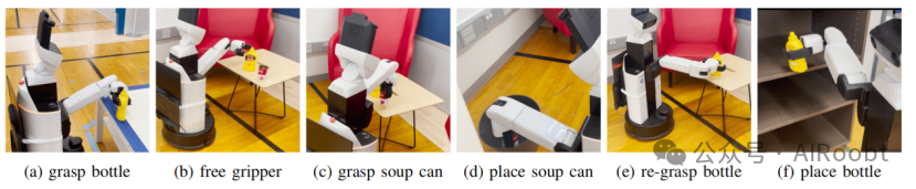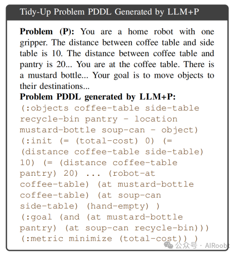 我们验证了 LLM+P 能够通过部署在一个实际的机器人上高效解决现实中的服务机器人问题,该机器人被分配了整理家庭的任务。用户要求机器人将芥末瓶从咖啡桌移动到食品储藏室,并将空罐头从侧桌扔掉。由于侧桌和回收箱位于从咖啡桌到食品储藏室的途中,最优的计划是将芥末瓶带到侧桌,扔掉罐头后重新抓住它,总代价为22。图2显示了 LLM+P 发现的最优计划。提示和生成的 PDDL 的部分内容如下。LLM-AS-P 输出了一个次优计划,该计划先将瓶子带到食品储藏室,然后返回取罐头,总代价为31。