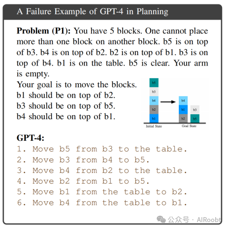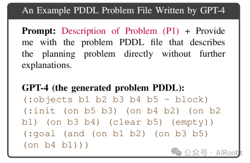 LLMs 在规划(或长时推理)方面表现不佳【9】,但它们擅长描述和翻译文本输入,包括将规划提示重写为 PDDL 格式。直觉上,我们可以将 PDDL 视为与英语不同的语言,因此将规划提示重写为 PDDL 实质上是一个“机器翻译”任务,而 LLMs 在此类任务中表现优异。以下是 GPT-4 无需任何提示工程生成的 PDDL 问题文件示例。我们可以看到,生成的文件看起来具有正确的 PDDL 语法,但使用了一个虚构的谓词(empty),并且遗漏了 b1 在桌子上的初始条件。