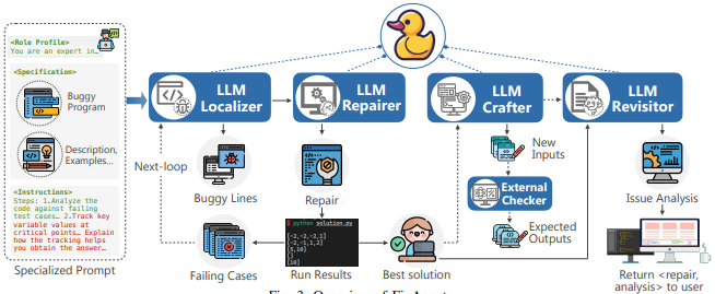 FixAgent 的核心系统架构由三名专业的 Agent 组成,各自负责不同的任务:一个专注于错误定位,一个负责生成补丁,还有一个专门负责修复后的审查工作。 除此之外,还有一个名为 Agent Crafter 的特别单元,它的任务是创建超越传统手动测试集的测试案例,以此来防止发生过度拟合的问题。如果检测到生成的补丁不可行或存在问题,系统会通过收集失败信息的反馈机制,重新启动修复流程。该框架首先设计了两个专业的 LLM 代理,分别担任 "错误定位专家" 和 "补丁生成专家" 的角色。随后,引入了第三个 LLM 代理,负责对错误和修复方案进行深入分析。每个代理都采用了"小黄鸭调试法",以确保其工作过程得到详尽的解释。 这种协同机制不仅能够在错误位置未知的情况下提供带有详细解释的程序修复方案,还能弥补错误定位器可能存在的不足。例如,它能够修复那些超出定位器识别范围的代码语句。