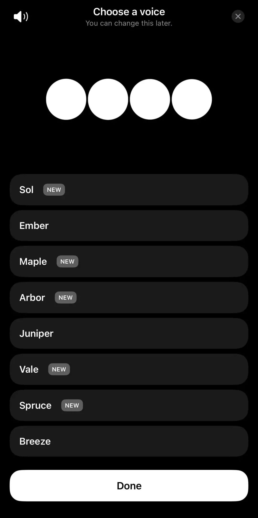 点击Continue,ChatGPT会指导你开始选择你喜欢的声音音色,此时已经可以看到新增加的五个声音了,标记为NEW的就是新声音。点击每种声音,可以进行试听,选择你喜欢的声音即可。