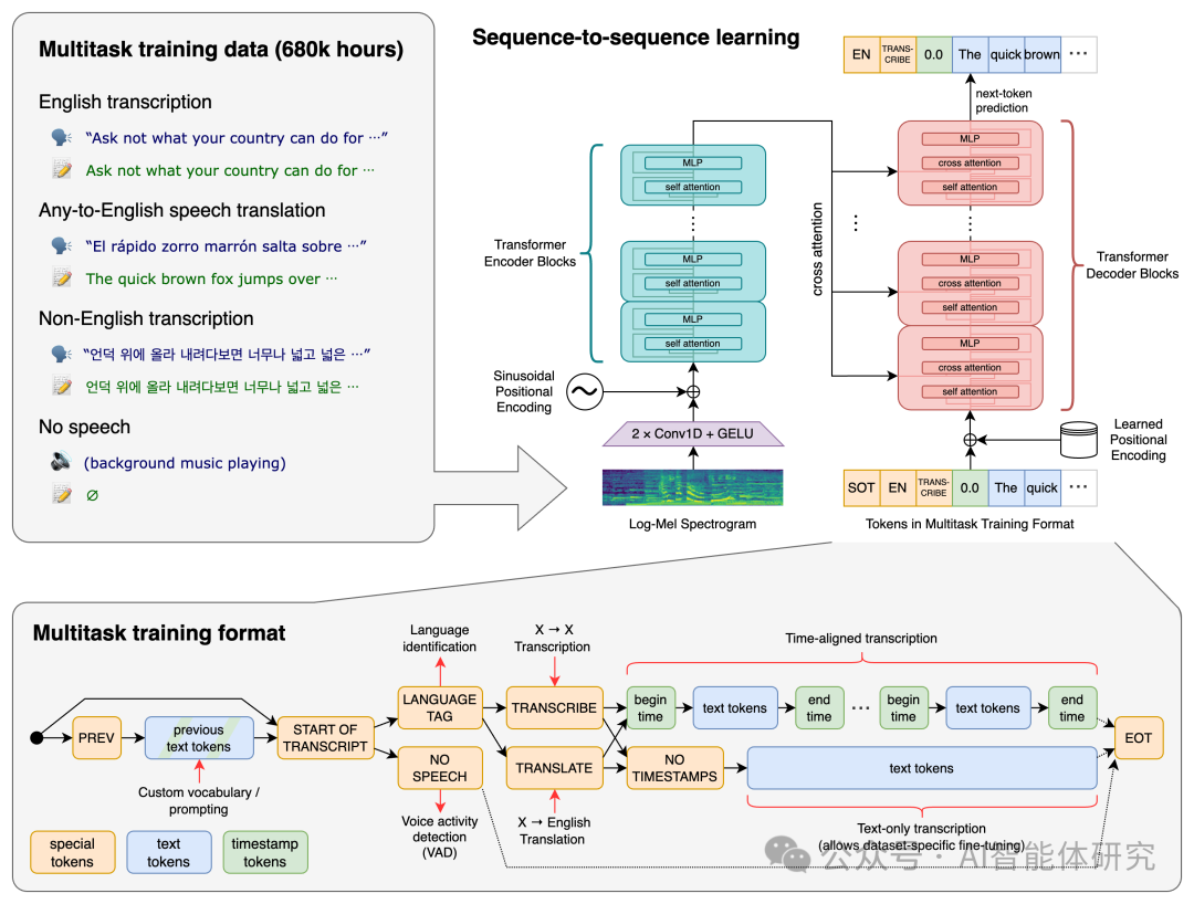 Whisper的核心是一个基于Transformer的序列到序列模型,其工作原理如下: