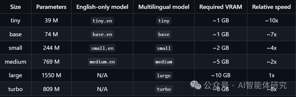 6. 多种模型大小:Whisper提供了从tiny到large不同大小的模型,用户可以根据自己的需求和硬件条件选择合适的版本。