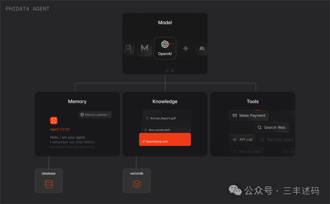 目前,市场上存在多种类型的人工智能助手,如智能手机上的语音助手(如Siri、Google Assistant、小爱同学等)、智能家居中心(如Amazon Echo、Google Home)、以及特定领域的专业助手(如医疗咨询助手、法律文档助手等)。这些助手极大地提高了人们的生活和工作效率,使得人工智能技术更加贴近普通人的生活。 ingFang SC", system-ui, -apple-system, BlinkMacSystemFont, "Helvetica Neue", "Hiragino Sans GB", "Microsoft YaHei UI", "Microsoft YaHei", Arial, sans-serif;letter-spacing: 0.544px;white-space: normal;background-color: rgb(255, 255, 255);visibility: visible;">介绍ingFang SC", system-ui, -apple-system, BlinkMacSystemFont, "Helvetica Neue", "Hiragino Sans GB", "Microsoft YaHei UI", "Microsoft YaHei", Arial, sans-serif;letter-spacing: 0.544px;white-space: normal;background-color: rgb(255, 255, 255);visibility: visible;">在人工智能领域,构建一个能够理解并响应用户需求的智能助手是一项挑战性的任务。PhiData作为一个开源框架,为开发者提供了构建具有长期记忆、丰富知识和强大工具的AI助手的可能性。PhiData的核心优势、应用示例以及如何使用PhiData来构建自己的AI助手。ingFang SC", system-ui, -apple-system, BlinkMacSystemFont, "Helvetica Neue", "Hiragino Sans GB", "Microsoft YaHei UI", "Microsoft YaHei", Arial, sans-serif;letter-spacing: 0.544px;white-space: normal;background-color: rgb(255, 255, 255);visibility: visible;">PhiData的设计理念如下,一个Assistant是以LLM为核心,加上长期记忆(Memory)、知识(结构化、非结构化)和工具(Tools,比如搜索、api调用等),这样就组成了一个完整的Assistant。 ingFang SC", system-ui, -apple-system, BlinkMacSystemFont, "Helvetica Neue", "Hiragino Sans GB", "Microsoft YaHei UI", "Microsoft YaHei", Arial, sans-serif;letter-spacing: 0.544px;white-space: normal;background-color: rgb(255, 255, 255);visibility: visible;">基于这些设计理念,PhiData可以帮助用户方便的构建助手应用,这些助手不仅拥有长期记忆,能够记住与用户的每一次对话,还具备丰富的业务知识和执行各种动作的能力。ingFang SC", "Microsoft YaHei", sans-serif;letter-spacing: normal;text-align: start;white-space: normal;background-color: rgb(255, 255, 255);">应用示例ingFang SC", "Microsoft YaHei", sans-serif;font-size: 16px;letter-spacing: normal;text-align: start;white-space: normal;background-color: rgb(255, 255, 255);">官方提供了一些exampleingFang SC", "Microsoft YaHei", sans-serif;font-size: 16px;letter-spacing: normal;text-align: start;white-space: normal;background-color: rgb(255, 255, 255);" class="list-paddingleft-1">LLM OS: 使用大型语言模型(LLMs)作为核心处理单元来构建一个新兴的操作系统. Autonomous RAG:自主RAG结合检索和生成任务的模型,赋予了LLMs搜索它们的知识库、互联网或聊天记录的能力。 Local RAG:本地RAG利用Ollama和PgVector等技术,使得RAG模型可以完全在本地运行。 Investment Researcher:投资研究员利用Llama3和Groq生成关于股票的投资报告. News Articles: 使用Llama3和Groq撰写新闻文章。 Video Summaries: 使用Llama3和Groq生成YouTube视频的摘要。 Research Assistant: 利用Llama3和Groq帮助研究人员编写研究报告。 ingFang SC", "Microsoft YaHei", sans-serif;letter-spacing: normal;text-align: start;white-space: normal;background-color: rgb(255, 255, 255);">PhiData开发agents#官方仓库的cookbook目录里有一个demo agents程序,使用streamlit开发了交互界面,官方默认是用的open ai的GPT4。我们简单修改,支持groq。