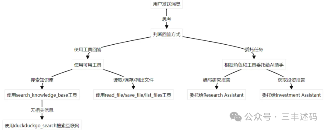 左边支持选择模型,选择Tools与Assistant。我们来一探究竟,这里的tools与Assistant是如何协作的。 运行这个agents,我们从debug信息可以看到prompt。 上面的instructions内容较多,我们抽主要的内容画一个graph图,就方便理解了: