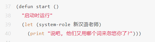 (defun start ()"启动时运行"(let (system-role 新汉语老师)(print "说吧, 他们又用哪个词来忽悠你了?")))