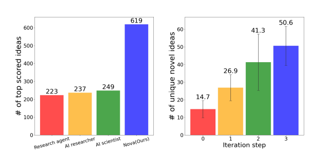 Nova 能够生成大量突破性的科学Idea,在创新性、价值性、可行性等方面可以媲美甚至超过人类科学家。