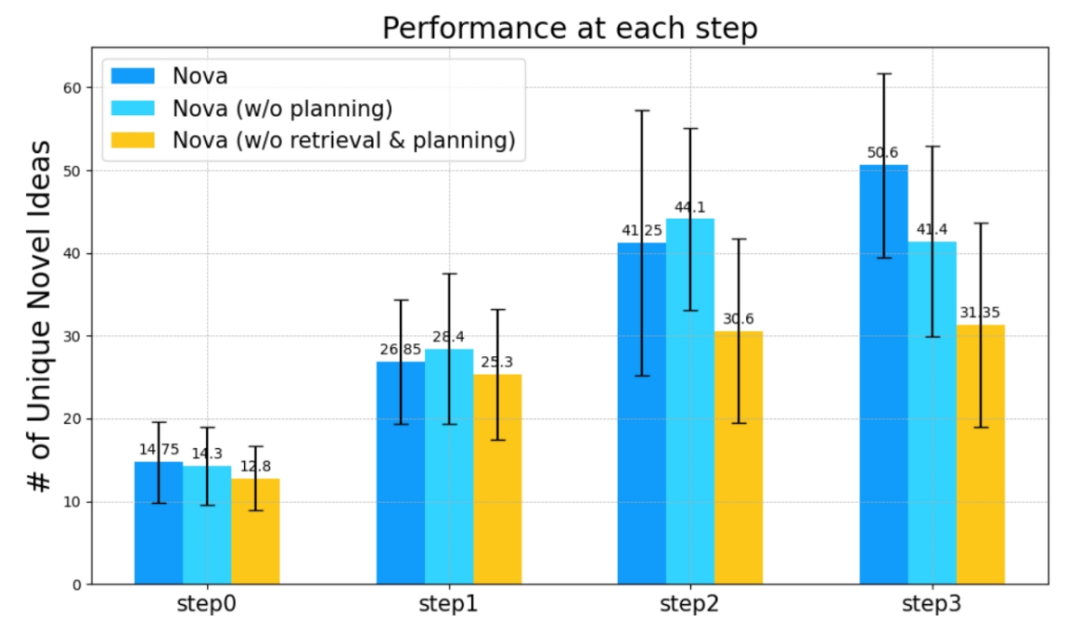 最终,团队为了探索文章提出的方法对持续生成新的idea的影响,还进一步通过消融实验证明了该方法能持续生成新颖的非重复的idea。