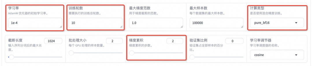 设置学习率为 1e-4,训练轮数为 10,更改计算类型为 pure_bf16,梯度累积为 2,有利于模型拟合。