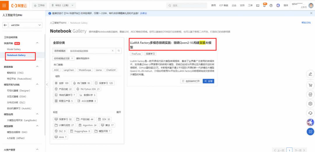 在Notebook Gallery页面,单击进入“LLaMA Factory多模态微调实践:微调Qwen2-VL构建文旅大模型”教程。