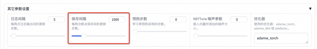在其他参数设置区域修改保存间隔为 1000,节省硬盘空间。