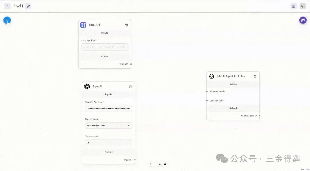 说是低代码,其实更多的时候它也是无代码,我们只需要在一块画布上,先点击左上角的添加按钮新增工具卡片,然后通过拖拉拽的方式将这些工具串起来就可以得到一个 AI 应用。