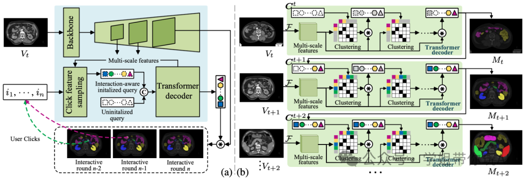 最近发现CVPR、ICCV、Neurips等顶会上有关聚类+Transformer的论文还真不少,而且基本都是效果很好,创新点很值得参考的成果。 比如CVPR2024的S2VNet新型框架,结合了聚类方法和Transformer架构来实现通用的医学图像分割,性能在多个数据集上超越了SOTA,且推理速度提升近15倍,内存使用减少48.2%。 可见聚类+Transformer这个处理序列/文本数据的创新方法确实有很高的研究价值,再加上它本身就有很多优势,不仅能增强特征表示和模型性能,还能优化计算效率,提高模型的可解释性,为图像分割等聚类任务提供新的解决方案。 Clustering propagation for universal medical image segmentation方法:论文提出了一种名为S2VNet的通用分割框架,通过切片到体积的传播策略,利用聚类方法来统一处理自动和交互式医学图像分割任务,克服了现有解决方案在慢速推理、远程切片联系不足等方面的局限性,显著提高了分割精度和效率。  创新点: - 提出了一种切片到体积的传播机制,通过聚类的方法将前一切片的聚类结果(即聚类中心)传递到下一切片。