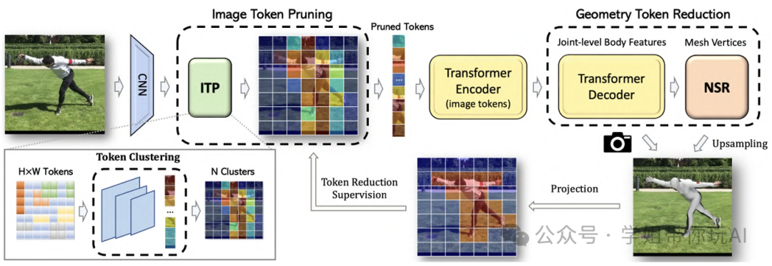 Tore: Token reduction for efficient human mesh recovery with transformer方法:论文提出了一种简单而有效的令牌减少(TORE)策略,通过结合3D几何结构和2D图像特征来减少Transformer中的冗余令牌。这种方法通过体结构的先验信息逐步恢复网格几何,并进行令牌聚类,以传递更少但更具辨识力的图像特征令牌。  创新点: - 提出了减少Transformer中冗余token的策略,以降低计算复杂度。