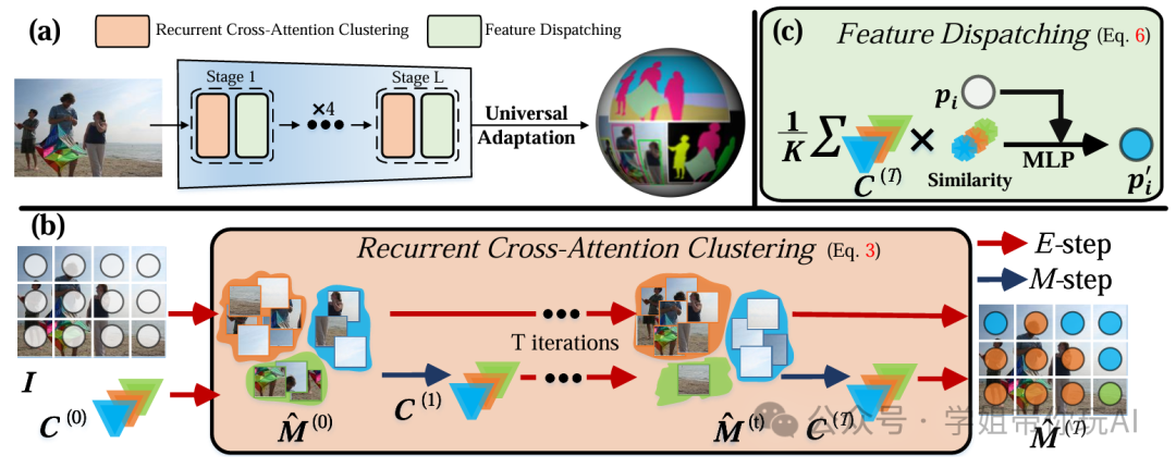 ClusterFomer: Clustering As A Universal Visual Learner方法:论文提出了一种名为CLUSTERFORMER的通用视觉模型,基于聚类和Transformer范式,通过递归交叉注意力聚类和特征分派的新颖设计,解决图像分类、目标检测和图像分割等异构视觉任务。  创新点: - 通过重新定义Transformer中的交叉注意力机制,实现了聚类中心的递归更新,增强了表示学习的能力。