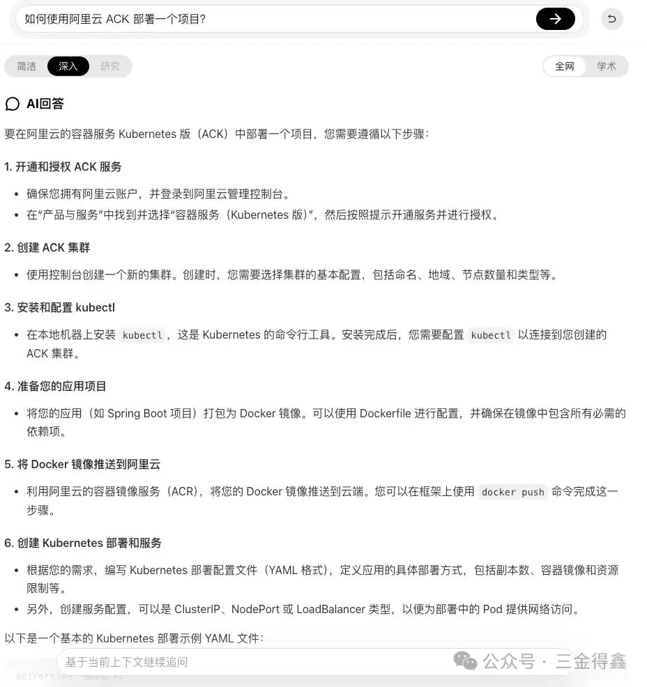 可以明显看到深入版会对搜索结果总结的更加详细,甚至会提供一份 YAML 文件示例。 如果再加上学术搜索,得出的结果会更加完备!