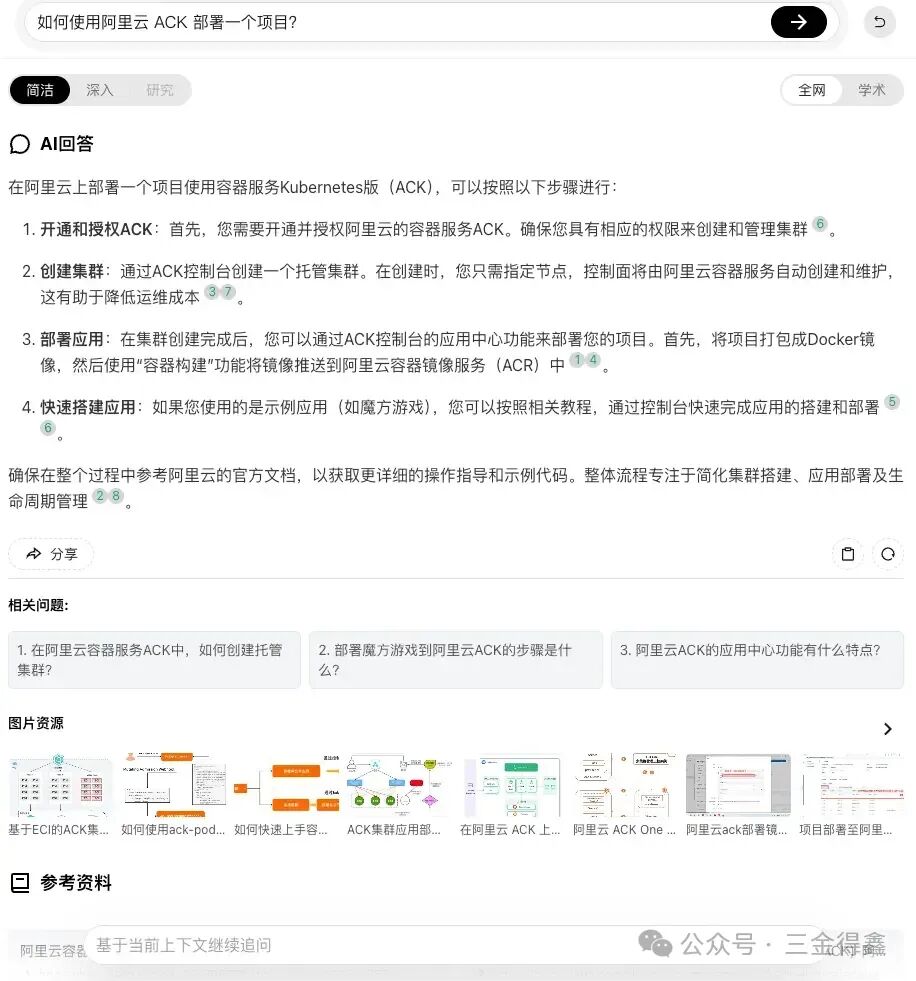搜索时会根据搜索程度的不同(目前可用的是简洁和深入)以及搜索范围的不同(全网和学术)会呈现不一样的结果。 这是简洁版搜索出来的内容: