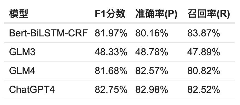 本文以前期准备的 353 条医案作为基础样本,并利用大语言模型进行知识抽取实验。在实验过程中,本文采用其他大语言模型进行数据标注,然后采取人工校对的方式,对标注结果进行验证和修正,以确保标注数据的准确性和可靠性,以此评价各个模型的知识抽取性能。本文选择 Bert-BiLSTM-CRF 模型作为基准模型进行实体关系联合抽取,并将 Bert-BiLSTM-CRF 模型与大语言模型自动化抽取的结果进行比较,本文选取的大语言模型主要有 GLM3、GLM4、ChatGPT4。本文采用的评估指标包括 F1 分数、准确率和召回率,实验结果如表所示。