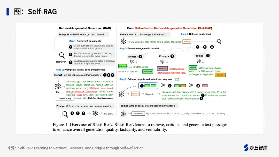 “自我反思检索-增强生成”(Self-RAG)框架,通过检索和自我反思来提高LM的质量和事实性。其框架训练一个单一的任意LM,该LM可按需自适应性地检索段落,并使用特殊标记(称为反思标记)生成和反思检索到的段落及其自身的生成。反思标记的生成使 LM 在推理阶段具有可控性,使其能够根据不同的任务要求调整自己的行为。实验结果表明,Self-RAG(7B和13B参数)在各种任务中的表现明显优于最先进的LLM和检索增强模型。具体来说,在开放域质量保证、推理和事实验证任务上,Self-RAG的表现优于ChatGPT和检索增强的Llama2-chat,而且与这些模型相比,在提高长篇文章的事实性和引用准确性方面也有显著提高。