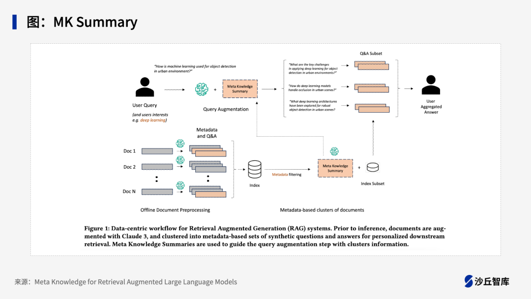 构建从大量不同文档中有效合成信息的RAG系统仍然是一项重大挑战。该团队为LLM引入了一种新颖的以数据为中心的RAG工作流程,将传统的“检索-读取”系统转变为更先进的 “准备-重写-检索-读取”框架,以实现对知识库更高层次的领域专家级理解。该方法依赖于为每个文档生成元数据和合成问答(QA),以及为基于元数据的文档集群引入元知识摘要(MK Summary)的新概念。所提出的创新技术实现了个性化的用户查询增强和跨知识库的深度信息检索。其团队研究有两个重大贡献:使用 LLM作为评估者,并采用新的性能比较指标,证明:(1)使用合成问题匹配的增强查询明显优于依赖文档分块的传统RAG管道(p< 0.01);(2)元知识增强查询还能显著提高检索精度和召回率,以及最终答案的广度、深度、相关性和特异性。其方法成本效益高,使用Claude 3 Haiku每2000篇研究论文的成本不到 20美元,而且可以对语言或嵌入模型进行任何微调,以进一步提高端到端RAG管道的性能。