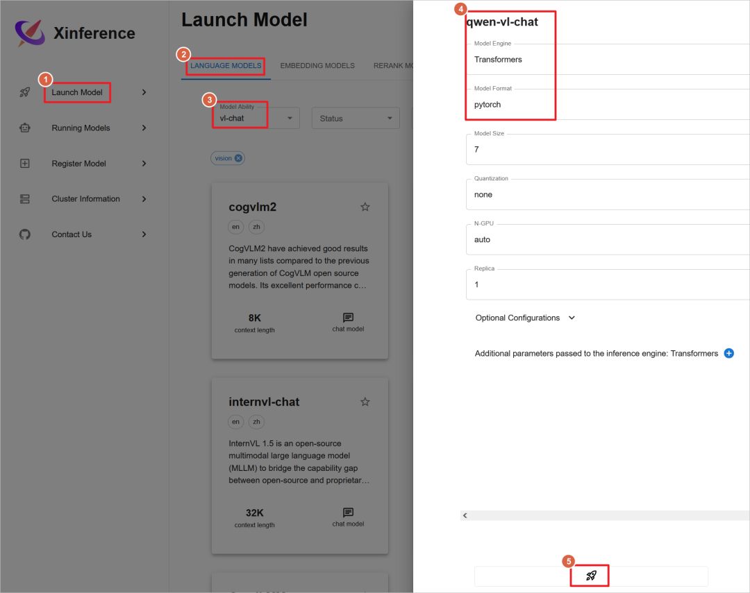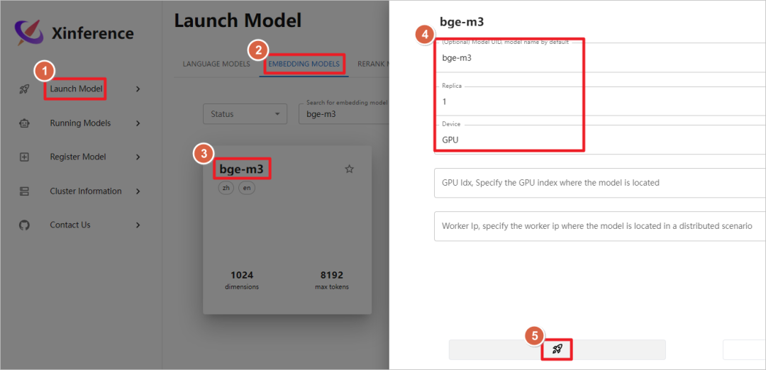 三、Xinference 本地运行大模型容器启动后,访问公网地址加上9997端口,启动qwen2-instruct模型。  使用Xinference自带的图形化聊天界面。  聊天测试。  测试图片生成模型,启动sd-trubo图片生成模型,模型下载和启动的时间较长,需要多等待一会,运行大概需要12G GPU。  启动图形化聊天界面。  使用提示词cartoon cloud生成图片,设置分辨率为512*512,点击Generate生成图片。图片像素设置的越大,生成的时间越长,占用的GPU越多,设置1024 * 1024像素,大致需要占用6G GPU。  Xinference目前无法同时运行多个大模型,在运行新的模型之前,需要停止之前的模型。 测试多模态模型,启动qwen-vl-chat视觉聊天模型,模型下载和启动也需要较长时间,模型需要20G GPU才能运行,所以至少需要g5.xlarge(24G GPU)才能运行,g4dn.xlarge(16G GPU)无法运行。  上传图片聊天测试。  四、Xinference 启动嵌入和重排模型Xinference只能同时启动一个语音模型、图片模型、语音模型,但是可以同时启动多个嵌入模型、重排模型。 这里使用的嵌入(embedding)模型是bge-m3,重排(reranker)模型是bge-reranker-v2-m3。  启动bge-m3嵌入模型,ollama后续可以调用这个模型。  模型正常启动,后续Dify可以调用此嵌入模型。  启动bge-reranker-v2-m3重排模型,ollama 后续可以调用这个模型。  模型正常启动,后续Dify可以调用此重排模型。