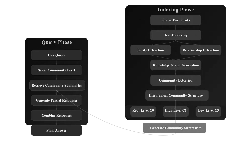 GraphRAG 的这些关键特性展示了它相对于传统 RAG 模型的优势,以及它在各种应用中革新检索增强生成的潜力。 2. GraphRAG 的应用场景GraphRAG的应用场景非常广泛。下面简要介绍 GraphRAG 的两个用例,以及它们是如何在每个用例中使用的。 2.1 医疗领域GraphRAG 可以帮助医学专业人员从大量的医学文献中快速找到相关信息,以回答关于患者症状、治疗和结果的复杂问题。通过将医学知识表示为一个结构化的知识图谱,GraphRAG 使得多跳推理能够连接不同的信息并提供全面的答案。这可以导致更快和更准确的诊断,更知情的治疗决定,并改善患者的结果。 2.2 银行金融业:GraphRAG 可以通过在知识图谱中表示客户交易、账户信息和行为模式来帮助银行检测和防止欺诈。通过分析图谱中的关系和异常,GraphRAG 可以识别可疑活动,并向银行的欺诈检测系统发出警报。这可以导致更快、更准确的欺诈检测,减少财务损失,提高客户对银行安全措施的信任。 3.GraphRAG的工作原理GraphRAG 首先从输入文档中提取实体和关系,生成知识图谱,然后通过图算法检测社区结构。接下来,使用 LLM 为每个社区生成自然语言摘要,保留分层结构。在用户查询时,系统先进行局部检索匹配高级主题,再进行全局检索获取详细信息,最后由 LLM 生成准确相关的响应。GraphRAG 的局部搜索针对特定上下文提供针对性信息,而全局搜索则利用预先计算的社区摘要,回答跨多个文档的综合查询。