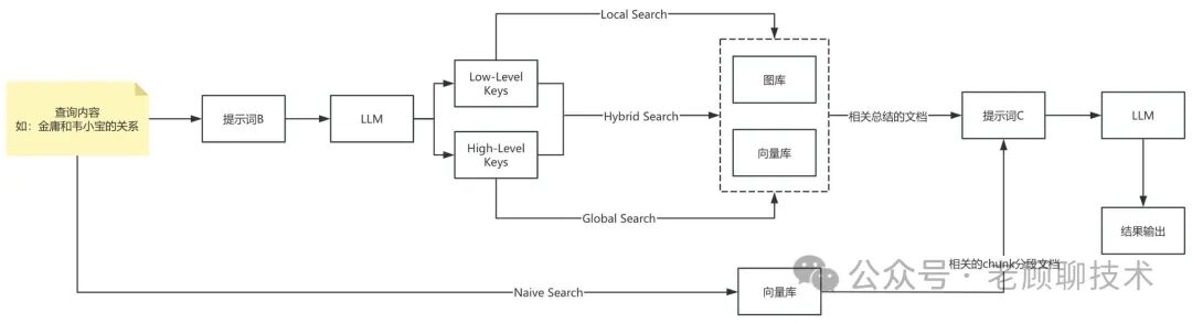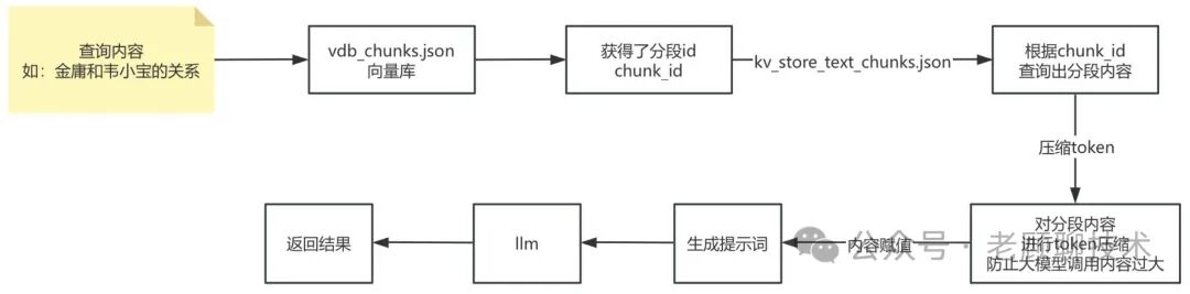 根据上面大模型返回的值,就是建立图谱关系,存储到graph_chunk_entity_relation.graphml中;再把对应的实体点和关系边里面的总结概要向量化存储到各自的vdb_entities.json和vdb_relationships.json 在处理上面的返回值时,系统还会进行重复节点的合并逻辑,主要是把总结概要合在一起,再交给大模型进行提炼总结 以上就把文档里面的内容建设了图谱和向量了,下面我们在分析一下是怎么查询的 naive search只是针对向量库进行查询 #在vdb_chunks.json中进行向量查询,获得文档分段idresults = await chunks_vdb.query(query, top_k=query_param.top_k)