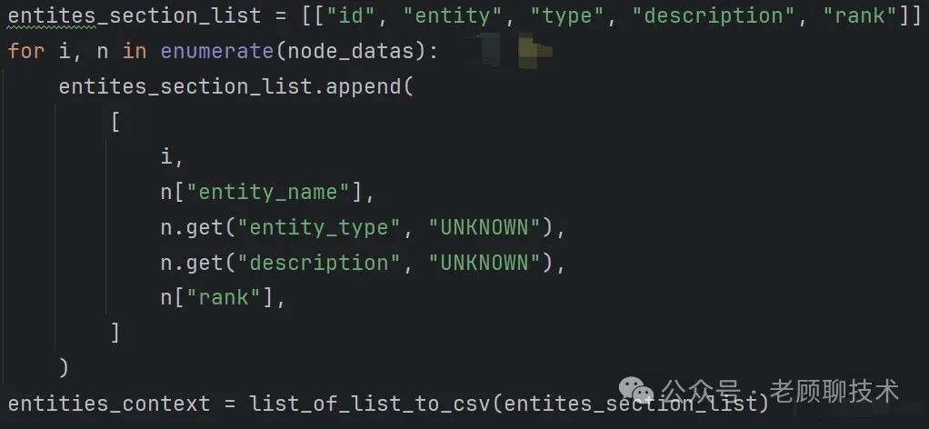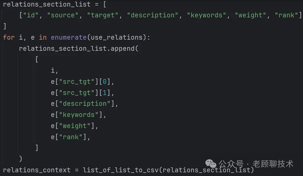 use_relations=await_find_most_related_edges_from_entities(node_datas,query_param,knowledge_graph_inst) 上面代码就把相关的实体点的边中的总结描述进行了获取 步骤五(把实体点信息转换为csv格式) 代码如下: