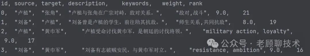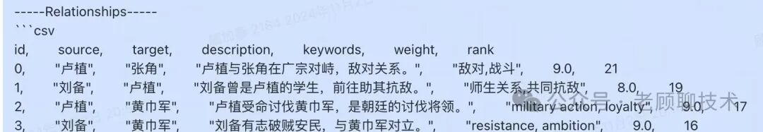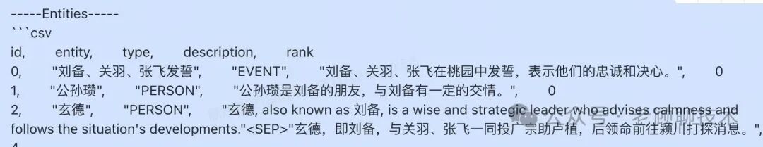 5、具体执行后大模型返回的值 我们拿了三国演义的第一回的内容进行分段,给大模型进行提取;下面是大模型返回的值(只截取部分数据) "e1546ef55aae150f342ad3f0617228ec":{"return":"(\"entity\"<|>\"朝廷\"<|>\"organization\"<|>\"朝廷referstothecentralgovernmentoftheHandynasty,whichisinvolvedinsendingofficialsandmakingdecisionsaboutmilitaryleadership.\")##(\"entity\"<|>\"黄门左丰\"<|>\"person\"<|>\"黄门左丰isanofficialsentbythe朝廷toinspectanddemandbribes,leadingtosubsequentconflicts.\")##(\"entity\"<|>\"董卓\"<|>\"person\"<|>\"董卓isamilitarygeneralsentbythe朝廷toreplacethecurrentcommanderandbringhimbacktothecapitalforpunishment.\")##(\"entity\"<|>\"张飞\"<|>\"person\"<|>\"张飞isacharacterknownforhisquicktemperandbravery,wantingtorescue卢植andshowingangertowards董卓.\")##(\"entity\"<|>\"玄德\"<|>\"person\"<|>\"玄德,alsoknownas刘备,isawiseandstrategicleaderwhoadvisescalmnessandfollowsthesituation'sdevelopments.\")##(\"entity\"<|>\"关公\"<|>\"person\"<|>\"关公,alsoknownas关羽,isaloyalandskilledwarriorwhosuggestsreturningto涿郡whentheirleaderisarrested.\")##(\"entity\"<|>\"卢植\"<|>\"person\"<|>\"卢植isamilitarycommanderwhoisarrestedby董卓andwhosesituationpromptsactionfrom张飞and玄德.\")##(\"entity\"<|>\"张角\"<|>\"person\"<|>\"张角isaleaderofthe黄巾rebellion,identifiedbyhistitle‘天公将军’andengagedinbattlewith董卓.\")##(\"entity\"<|>\"涿郡\"<|>\"geo\"<|>\"涿郡isageographicallocationwhere玄德andhiscompanionsdecidetoreturnaftertheirleaderisarrested.\")##(\"entity\"<|>\"汉军大败\"<|>\"event\"<|>\"汉军大败referstothesignificantdefeatoftheHandynasty'sarmyby张角的forces,leadingtoacriticalsituation.\")##(\"relationship\"<|>\"黄门左丰\"<|>\"朝廷\"<|>\"黄门左丰isanofficialsentbythe朝廷,representingthegovernment'sauthorityanddemands.\"<|>\"officialdelegation,corruption\"<|>8)##(\"relationship\"<|>\"董卓\"<|>\"朝廷\"<|>\"董卓isappointedbythe朝廷toreplacethecurrentcommander,showingthegovernment'sinterventioninmilitaryaffairs.\"<|>\"militarycommand,politicalintervention\"<|>9)##(\"relationship\"<|>\"张飞\"<|>\"卢植\"<|>\"张飞wantstorescue卢植,indicatingastrongsenseofloyaltyandurgency.\"<|>\"loyalty,rescueattempt\"<|>10)##(\"relationship\"<|>\"玄德\"<|>\"董卓\"<|>\"玄德interactswith董卓,experiencingdisrespectandconflict,highlightingthesocialdynamicsandtension.\"<|>\"socialconflict,disrespect\"<|>7)##(\"relationship\"<|>\"关公\"<|>\"涿郡\"<|>\"关公suggestsreturningto涿郡,showingstrategicthinkingandasenseofbelonging.\"<|>\"strategicretreat,hometerritory\"<|>6)##(\"relationship\"<|>\"张角\"<|>\"汉军大败\"<|>\"张角leadstheforcesthatdefeattheHanarmy,signifyinghismilitaryprowessandtheseverityoftherebellion.\"<|>\"militaryvictory,rebellion\"<|>9)##(\"content_keywords\"<|>\"militaryconflict,politicalintrigue,rebellion,loyalty,strategicretreat\")<|COMPLETE|>","model":"glm-4-plus"},从上面的大模型返回的格式发现,实体点以entity开头,关系边以relationship开头。 关系边relationship最后面会有个此边的权重数值。