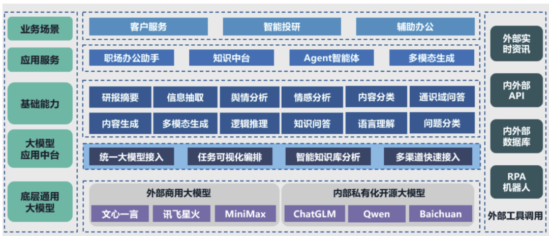它通过整合不同底层大模型的接口差异,实现各种内外部大模型的快速接入。这个平台能够灵活地匹配业务场景的数据安全要求,例如,对于需要分析的研报和资讯,可以对接外部模型,而对于处理内部敏感数据,则可以基于私有化开源模型和专属向量知识库进行大模型技术的安全应用。