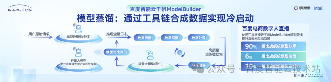 今天,基于我们平台越来越多的场景实践,沉淀了一系列的模型精调样板间,进一步降低模型调优门槛。 企业只需要跟随样板间的步骤,一步一步设置模型训练的参数,就可以训练出符合企业需求的场景化模型。 ingFang SC", "Hiragino Sans GB", "Microsoft YaHei UI", "Microsoft YaHei", Arial, sans-serif;font-size: var(--articleFontsize);letter-spacing: 0.034em;width: 100%;height: auto;"/> 我们在千帆 ModelBuilder 工具链不断迭代的过程中,又给大家提供了一个新的方法——模型蒸馏。通过调用旗舰大模型产生的问答对,经过筛选得到有效的训练数据。在降低数据标注成本的同时,通过精调得到成本更低、耗时更优、效果趋近旗舰模型的轻量级大模型。举个例子,百度电商数字人直播,通过模型蒸馏后,相比旗舰级模型效果能达到 90%,同时达到旗舰级 6 倍的速度,10% 的成本;更好的适应我们场景应用在效果、性能和成本之间的平衡。