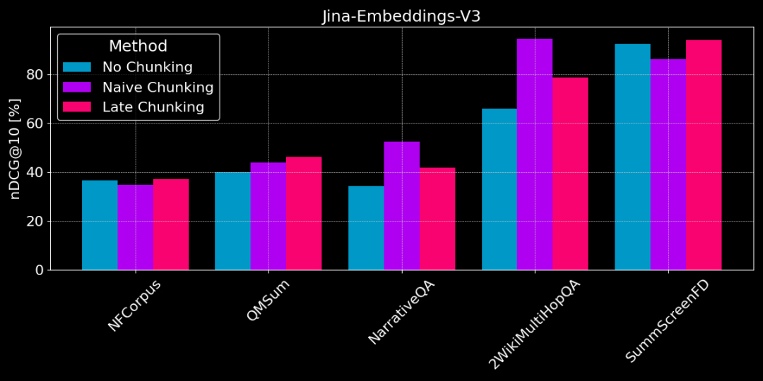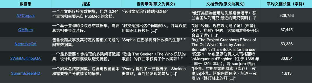 为了对比,我们在 5 个数据集上,使用 jina-embeddings-v3 进行了实验,所有长文本都被截断至模型最大输入长度 (8192 Tokens),并按每 64 个 Token 为一个文本块进行分割。
