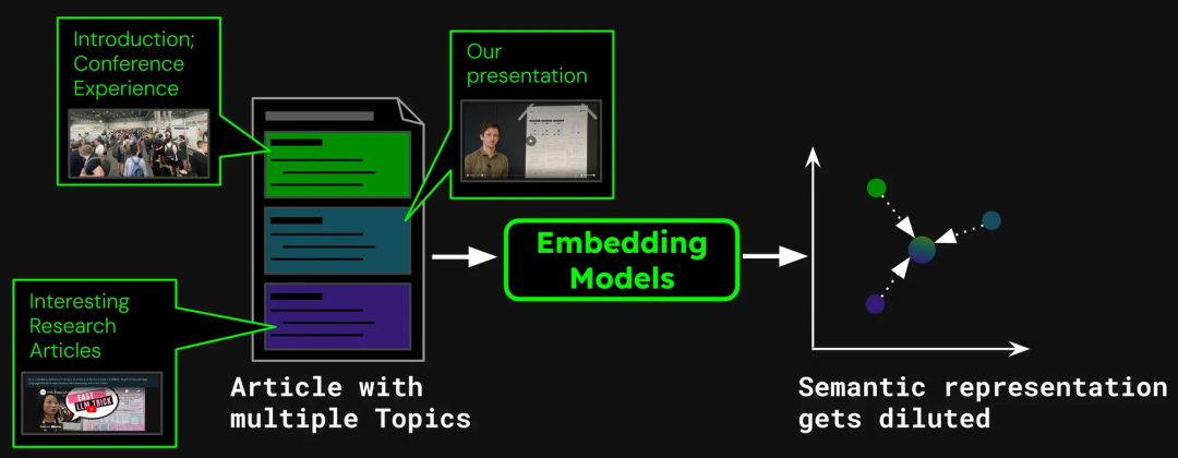 表示稀释会削弱文本向量的精度。虽然博客文章包含了多个主题,但用户的搜索查询往往只关注其中一个。用单个向量表示整篇文章,相当于将所有主题信息压缩到向量空间中的一个点。随着更多文本添加到模型的输入中,这个向量会逐渐代表文章的整体主题,稀释特定段落或主题的细节。这就像把多种颜料混合成了一种颜色,用户想找到某种特定颜色时,就很难从混合色中识别出来。