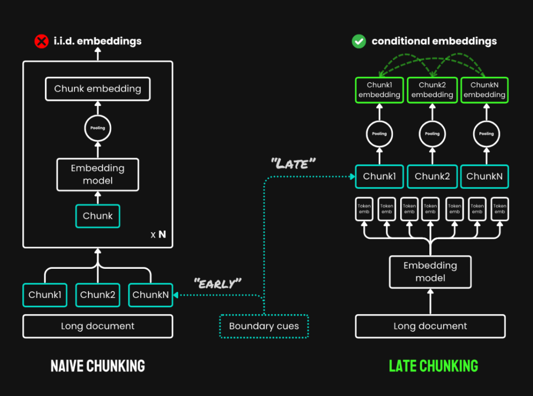 3. 迟分(Late Chunking):是一种先通读全文再分块的新方法,包含两个主要步骤: