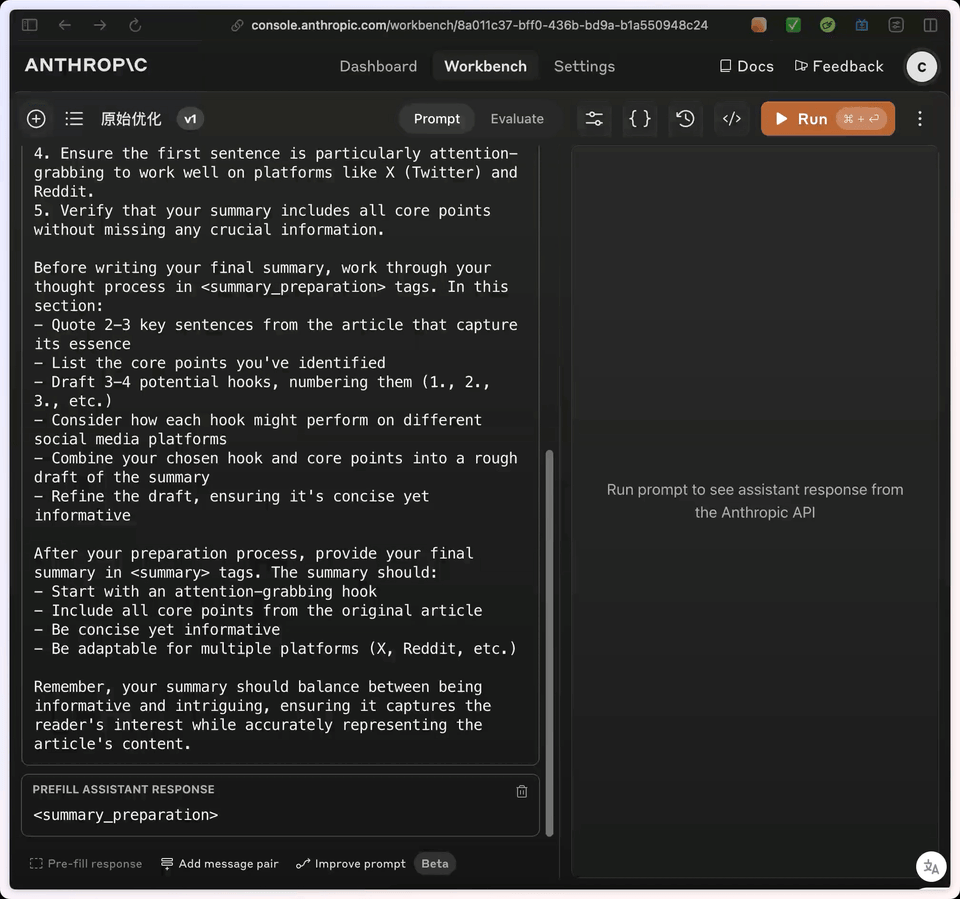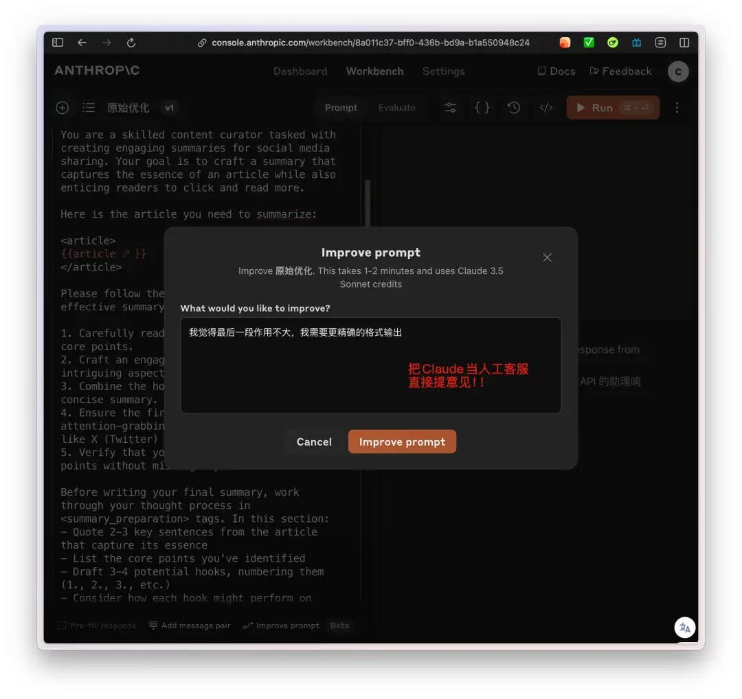 因为 Prompt Console 还支持反馈机制。我可以主动标注提示语中哪些部分对输出结果有效,Claude 会进一步优化提示词。