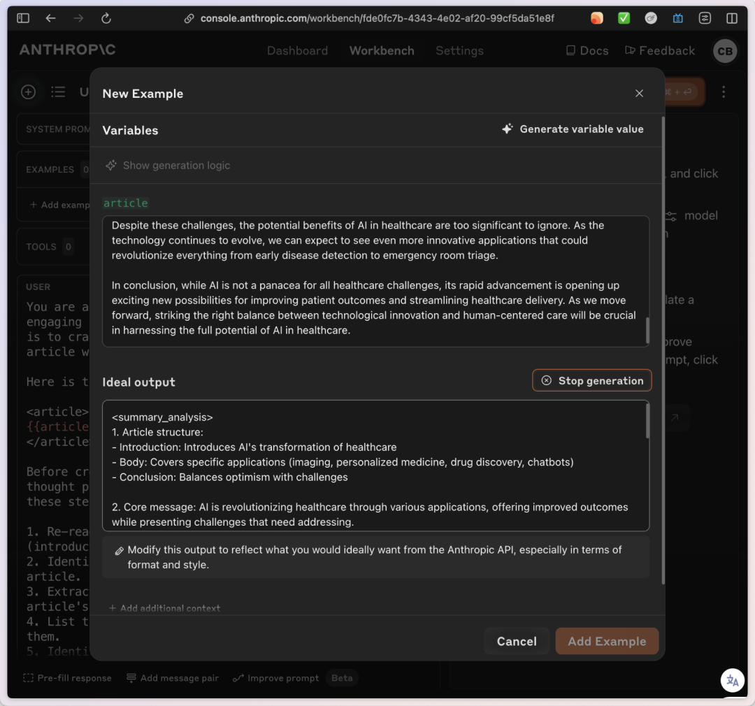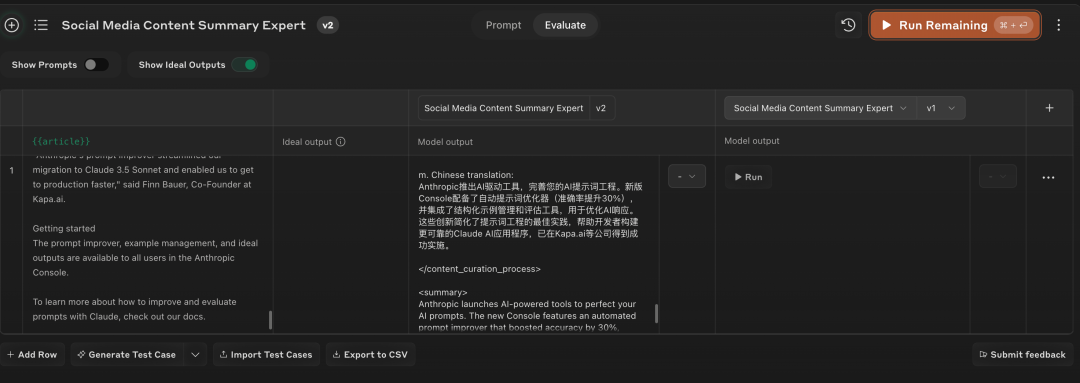 还有就是支持快速迭代。每次遇到想要好的摘要时,我可以直接加到工作台里,进行打分。Claude 就会加班加点,循环优化直到我满意为止,省去了还要给它解释为啥这个例子深得我心的麻烦。